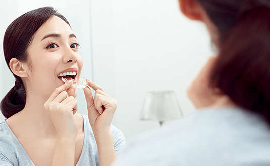 従来のワイヤー矯正のように矯正治療中にワイヤーが目立たず、 透明な素材のマウスピースを使用しているため治療期間中も目立たず矯正治療が可能せです。 また、食事や歯磨きなどの際に、ご自身でマウスピースを取り外し可能となります。